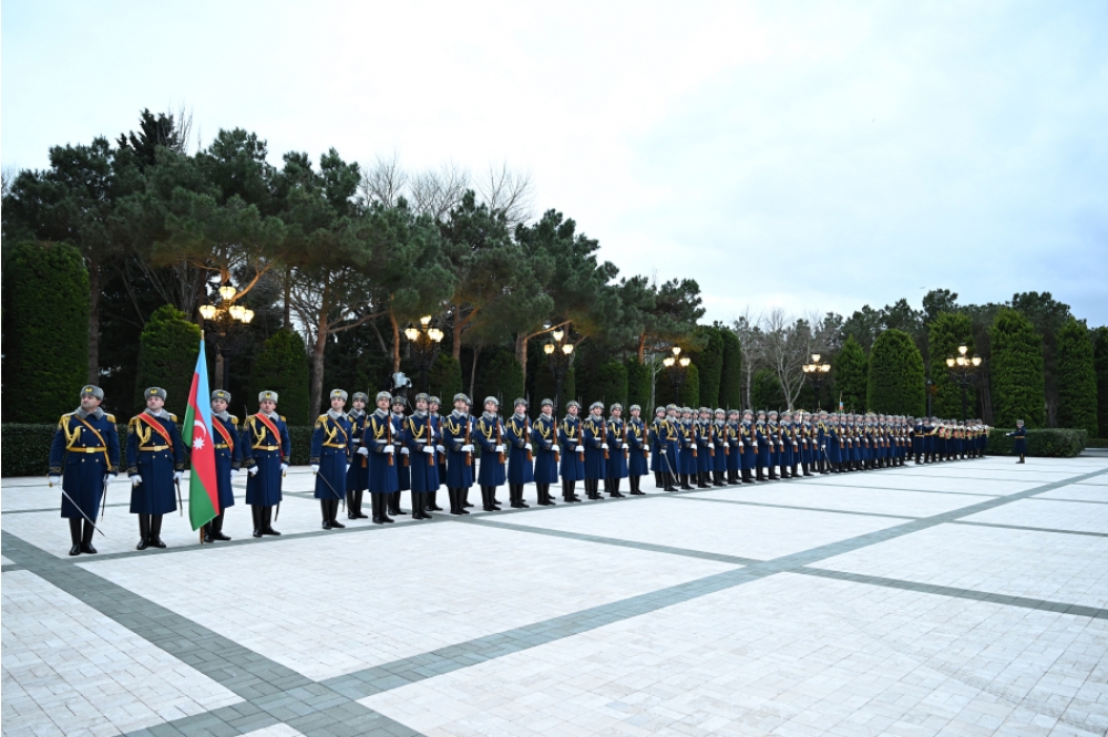 Fəxri qarovul dəstəsi hərbi marşın sədaları altında Azərbaycan Prezidenti İlham Əliyevin və Amerika Birləşmiş Ştatlarının Vitse-prezidenti Ceyms Devid Vensin qarşısından keçdi.