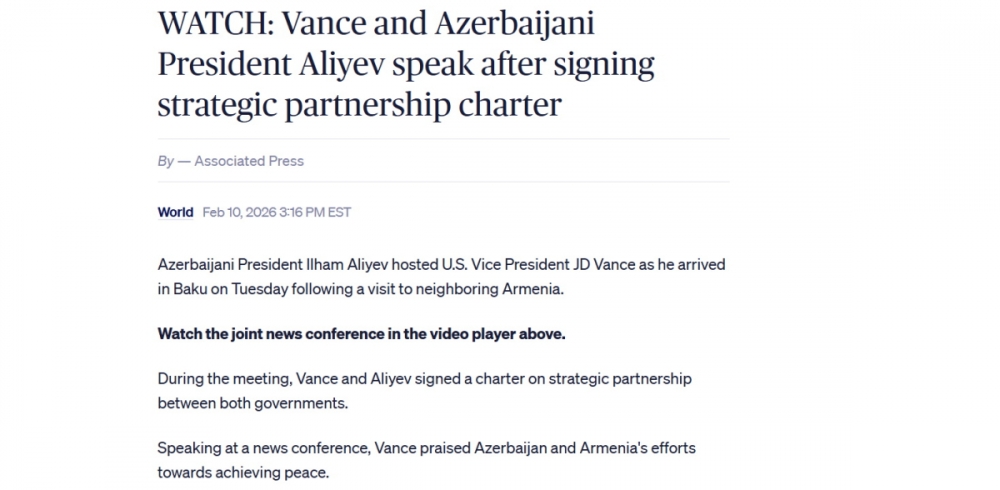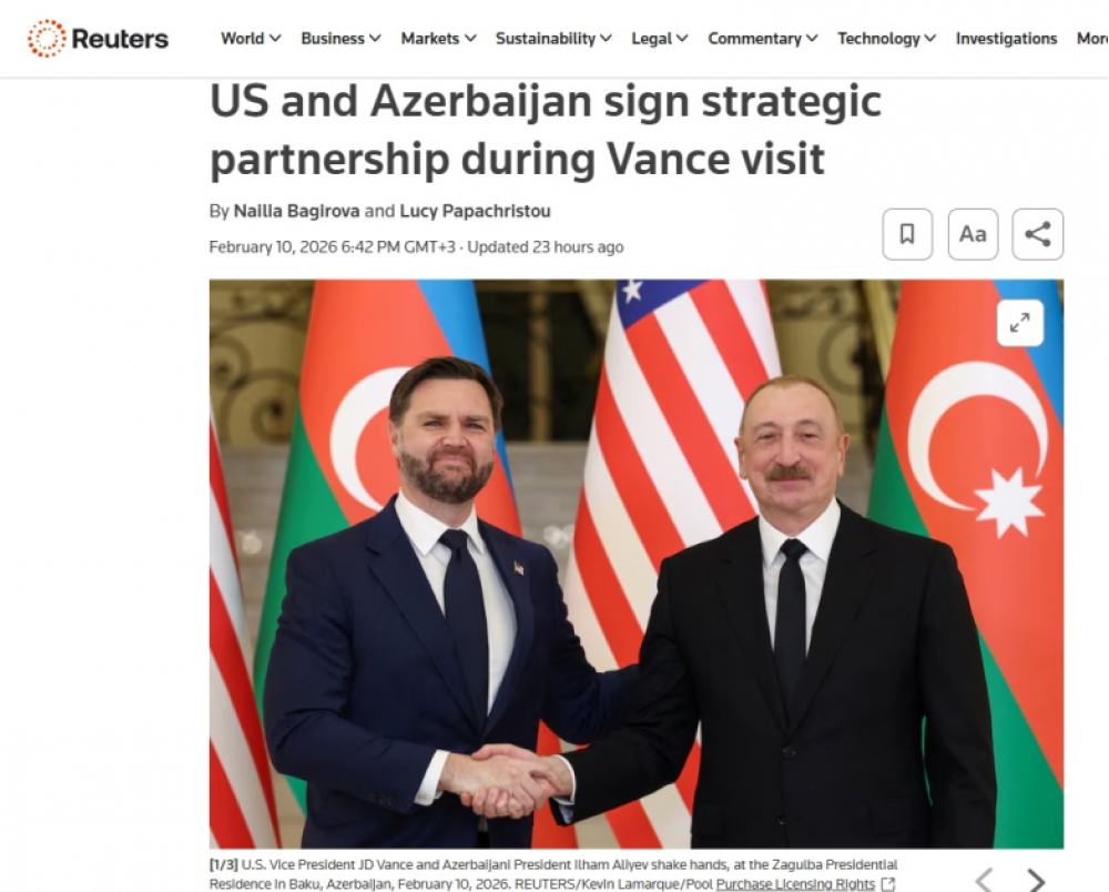Bununla yanaşı, “Reuters”də dərc olunmuş “ABŞ və Azərbaycan Vensin səfəri çərçivəsində strateji tərəfdaşlıq müqaviləsi imzalayıblar” sərlövhəli yazıda qeyd olunur ki, Azərbaycan Prezidenti İlham Əliyev mətbuata birgə bəyanat zamanı ABŞ və Azərbaycan arasında münasibətlərin bu gün tamamilə yeni mərhələyə qədəm qoyduğunu deyib. Yazıya əsasən, Vens bildirib ki, ABŞ Azərbaycana ərazi sularını qorumaq üçün gəmilər göndərəcək. Vurğulanır ki, Xartiya ilk dəfə avqust ayında Vaşinqtonda Prezident İlham Əliyevlə Prezident Donald Tramp arasında danışıqlarda təqdim olunub.