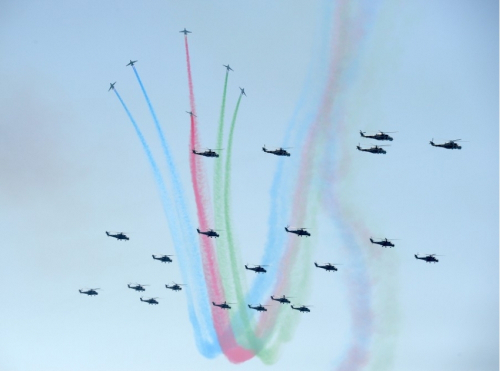 Paytaxt səmasında təntənəli aviasiya nümayişləri davam edib. Əvvəlcə polkovnik-leytenant Ziya Əliyevin başçılıq etdiyi uzaqmənzilli hava-yer tipli raketlərlə təchiz olunmuş “Mİ-17” döyüş-nəqliyyat helikopterləri beşliyi klin düzülüşündə Azadlıq meydanının üzərindən keçib. Növbəti mərhələdə “Mİ-17” döyüş-nəqliyyat helikopterlərinin beşliyi klin düzülüşündə uçaraq tamaşaçılara heyranedici anlar yaşadıb. Bu beşliyə “Vətənə xidmətə görə” ordenli polkovnik-leytenant Sabit Hüseynov rəhbərlik edib.