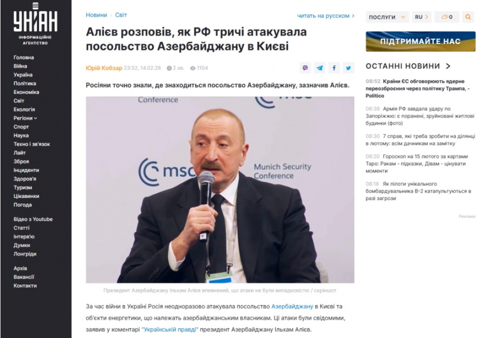 Ukrayna mediası Prezident İlham Əliyevin Münxen Təhlükəsizlik Konfransında iştirakına geniş yer ayırıb