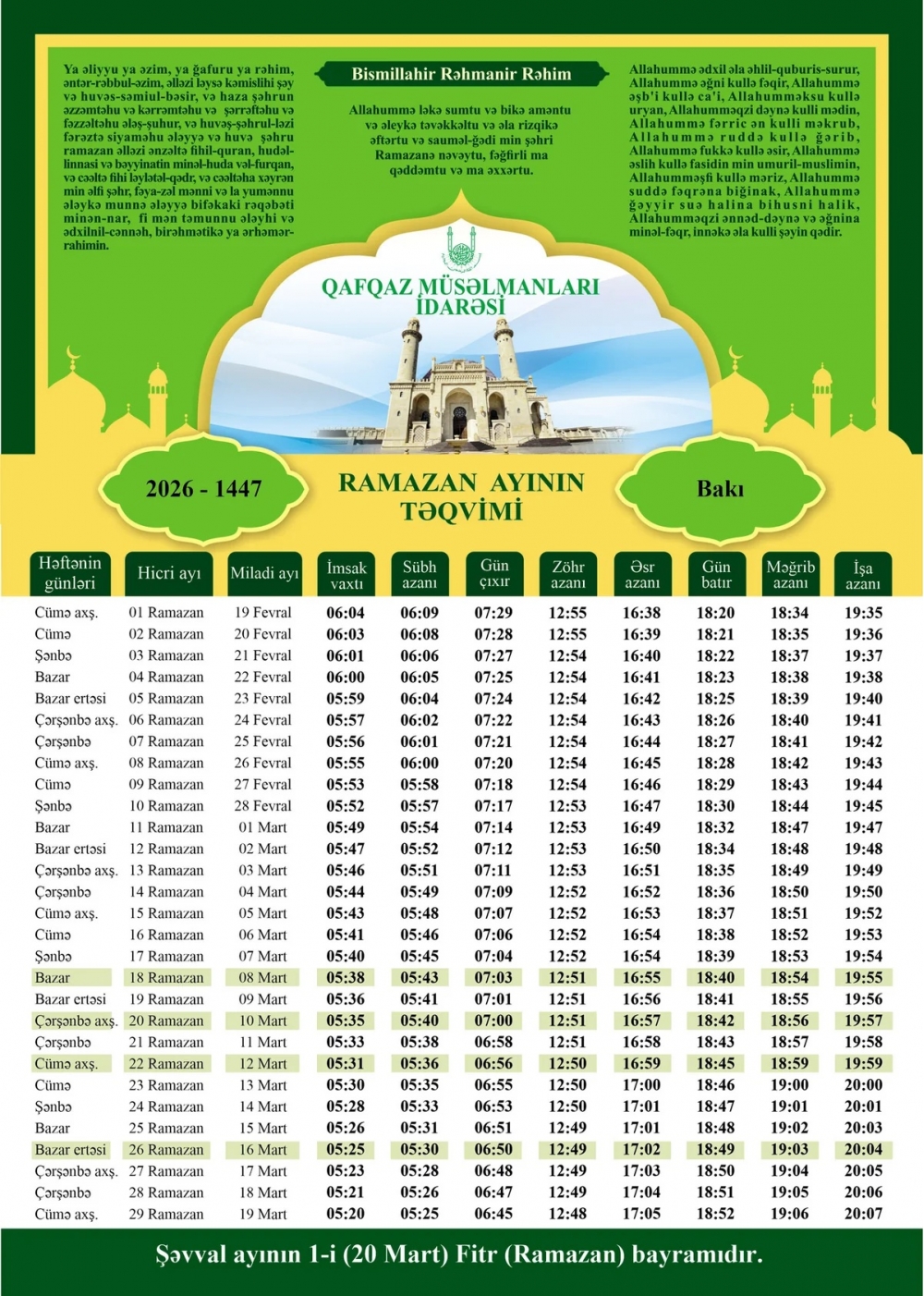 Bundan başqa, Ramazan ayının gündəlik duaları, imsak-iftar vaxtlarını əks etdirən xüsusi təqvimə əsasən, ilk Qədr (Əhya) gecəsi martın 8-i, digərləri isə martın 10-u, 12-si və 16-sı olacaq.