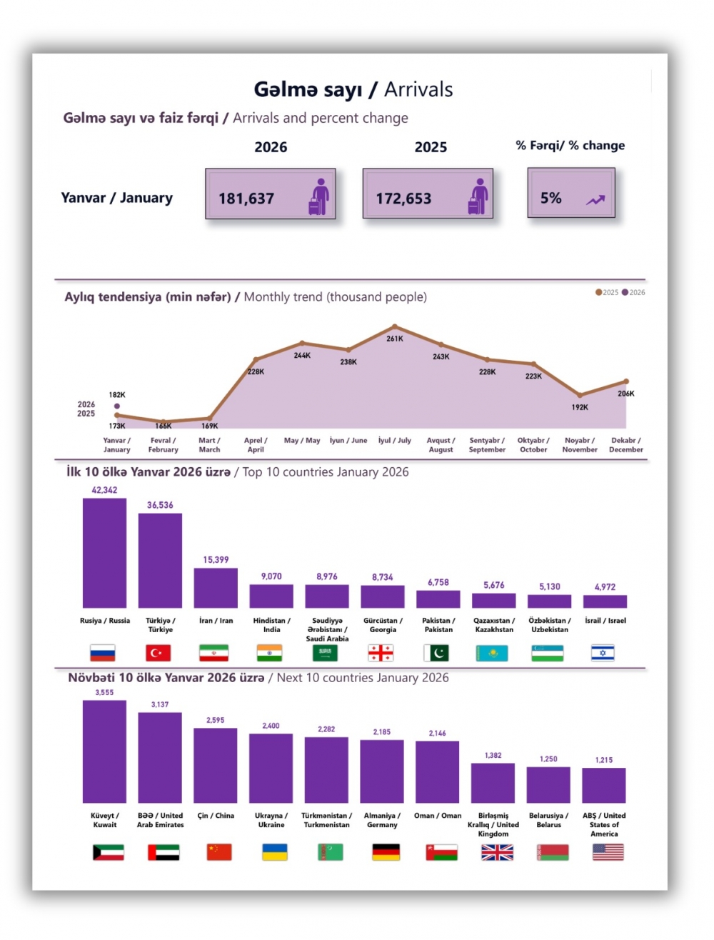 Bu ilin yanvar ayında Azərbaycana 181 637 əcnəbi vətəndaş səfər edib ki, bu da ötən ilin eyni ayı ilə müqayisədə 8 984 nəfər və yaxud 5 % çoxdur.
