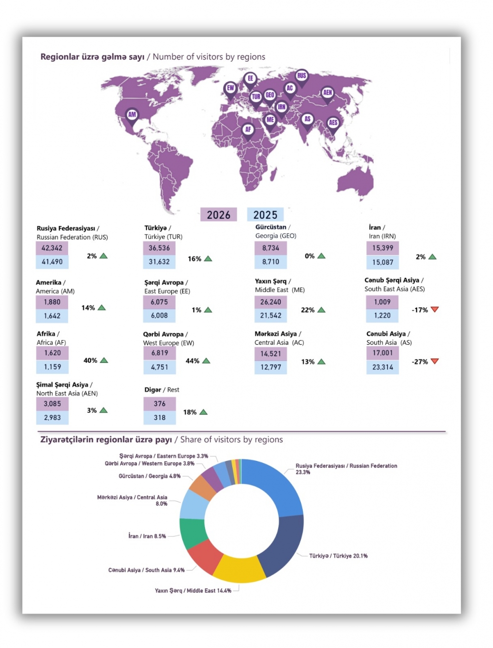 Regionlar üzrə dinamika göstərir ki, Yaxın Şərq ölkələrindən gələnlərin sayı 22 % artaraq 26 240 nəfərə, Qərbi Avropa ölkələrindən gələnlərin sayı isə 44 % artaraq 6 819 nəfərə çatıb.