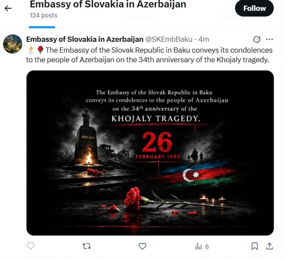 Slovakiya səfirliyi Xocalı soyqırımı ilə bağlı paylaşım edib