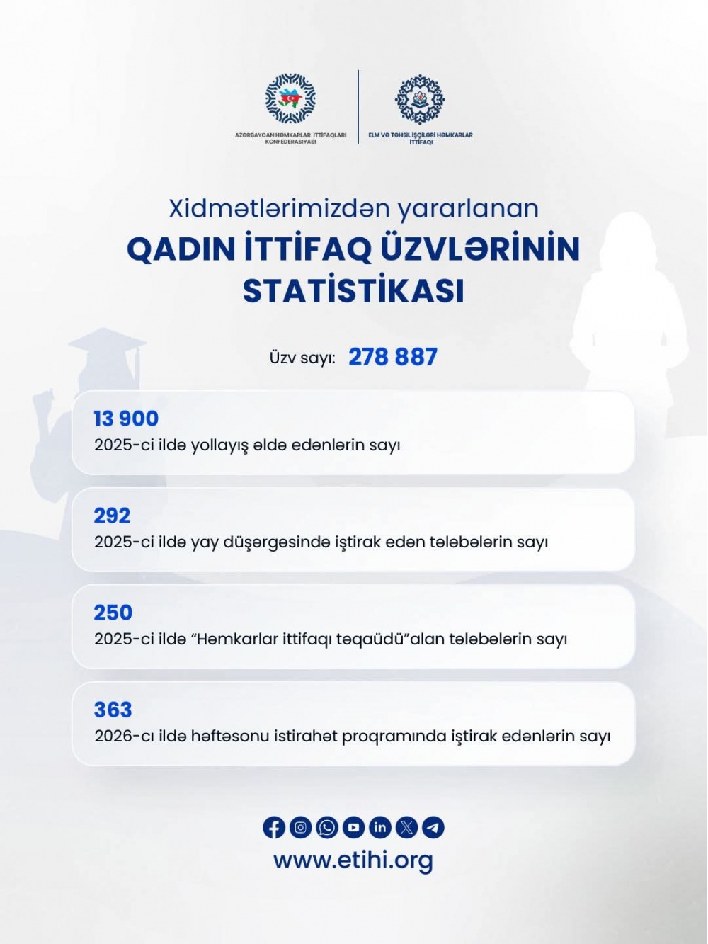 Komitə sədri paylaşımında qeyd edib ki, ETİHİ-nin 278 min 887 qadın üzvü var: "Bu göstərici təhsil sahəsində qadınların güclü mövqeyə malik olduğunu aydın şəkildə nümayiş etdirir.