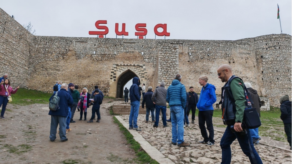 “İki sahil” xəbər verir ki, 37 ölkədən 79 nəfər səyyahın daxil olduğu heyət əvvəlcə Şuşa şəhərinin mərkəzi meydanında Azərbaycanın tanınmış şəxsiyyətləri Natəvan, Bülbül və Üzeyir Hacıbəylinin güllələnmiş heykəllərinə baxıblar. Qonaqlara Şuşa şəhəri, onun işğal dövründəki vəziyyəti və burada həyata keçirilən yenidənqurma işləri barədə məlumat verilib. Bildirilib ki, otuzillik işğal dövründə Şuşa şəhərindəki tarixi binalar, məscidlər, abidələr erməni vandalizminə məruz qalıb. Şuşa işğaldan azad edildikdən sonra burada genişmiqyaslı bərpa-quruculuq işlərinə start verilib. İnfrastrukturun qurulması ilə yanaşı, Şuşada şəhərin əsl tarixi simasının, tarix və mədəniyyət abidələrinin bərpasına başlanılıb.