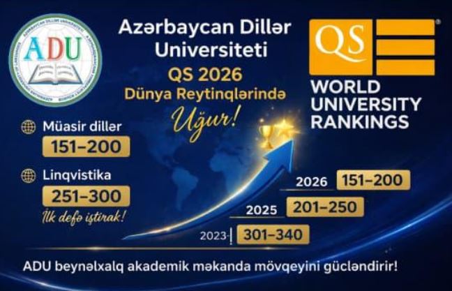 Azərbaycandan ilk dəfə iki ali təhsil müəssisəsi (ADU və UNEC) QS dünya universitetlərinin reytinqinə düşmüşdür. Azərbaycan Dillər Universiteti (ADU) "Müasir dillər" üzrə dünyada ən yaxşı 301-340 universitetlər qrupuna daxil edilmişdir. Bu, universitetimizin, bütövlükdə təhsilimizin böyük uğurudur.