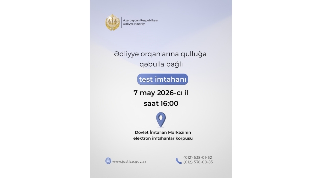 Ədliyyə orqanlarına qulluğa qəbulla bağlı növbəti test imtahanı may ayının 7-də keçiriləcək