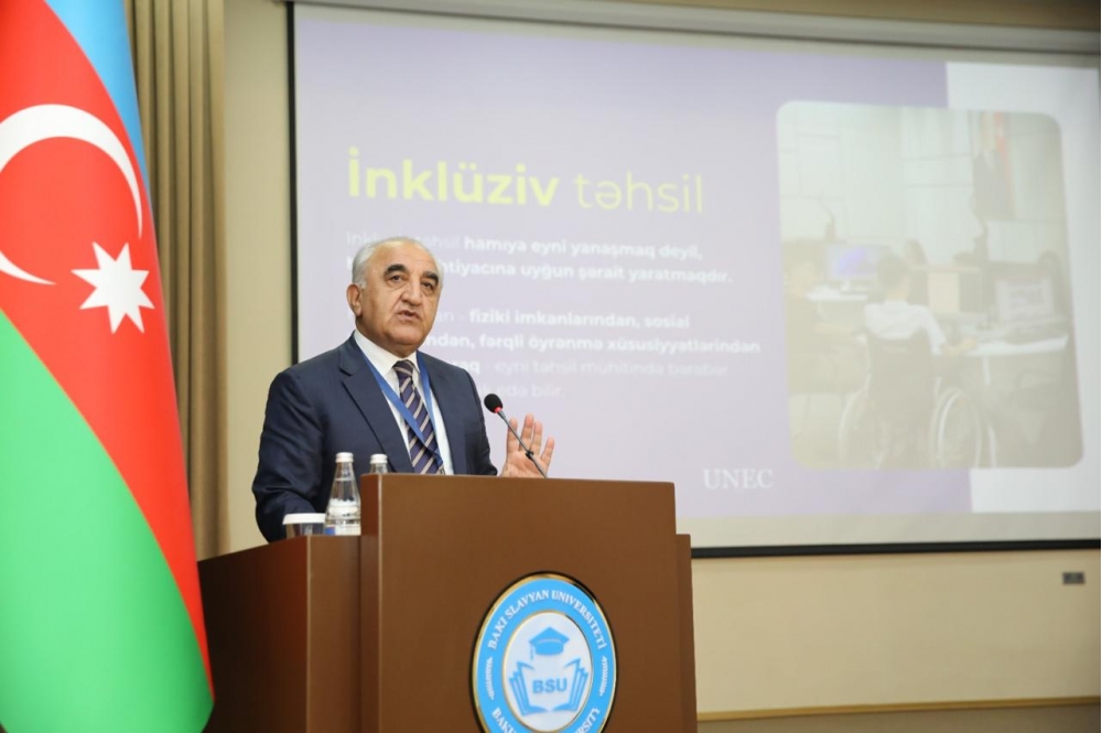 UNEC-in rektoru Ədalət Muradov çıxış edərək bildirib ki, inklüziv təhsil təkcə bərabərlik və ədalət məsələsi deyil, eyni zamanda təhsil sistemində köklü dəyişiklikləri tələb edən mühüm bir yanaşmadır. Təqdimatı əsasında çıxışını davam etdirən rektor qeyd edib ki, inklüziv yanaşma yalnız hamıya eyni münasibəti deyil, eyni zamanda hər bir fərdin potensialını reallaşdırmaq üçün uyğun şəraitin yaradılmasını nəzərdə tutur. Ə. Muradov çıxışında bildirib ki, inklüziv universitet anlayışı nisbətən yeni konsepsiyadır və BSU-nun gələcəkdə inklüziv universitet statusuna iddia edən ali təhsil müəssisələrindən biri olacağına əminliyini ifad edib.