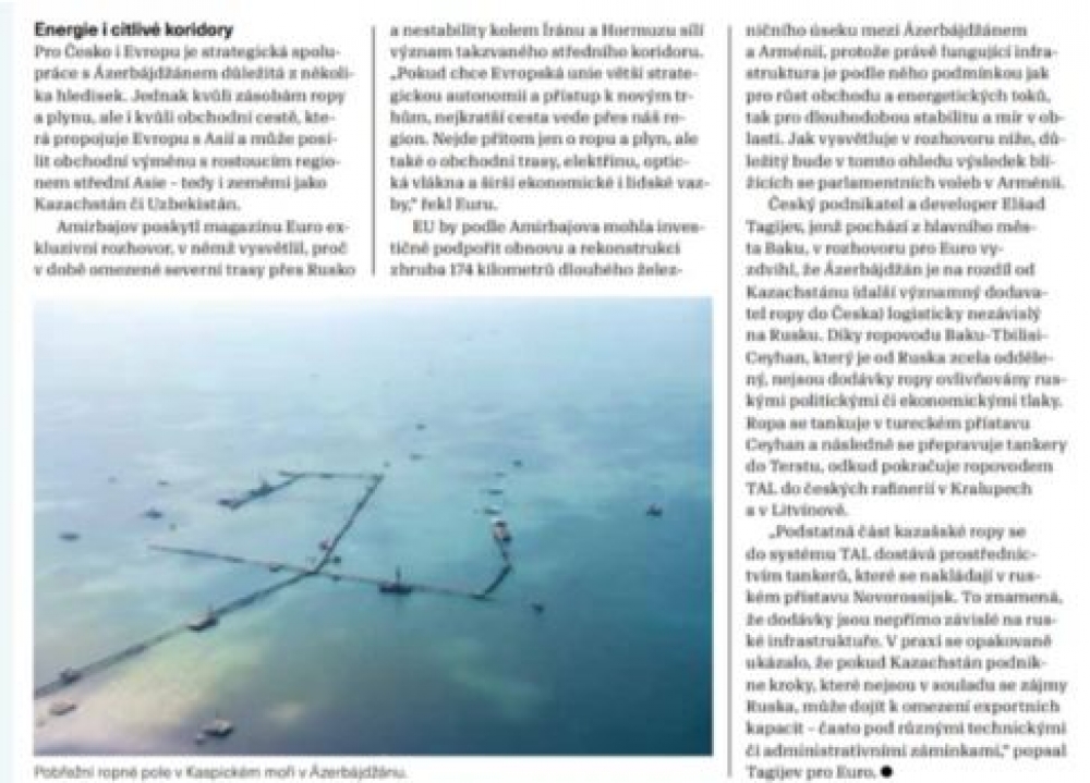 Azərbaycan Respublikası Prezidentinin xüsusi tapşırıqlar üzrə nümayəndəsi Elçin Əmirbəyov Çexiyaya işgüzar səfəri çərçivəsində "Euro" ("Financial Times") jurnalına müsahibə verib.