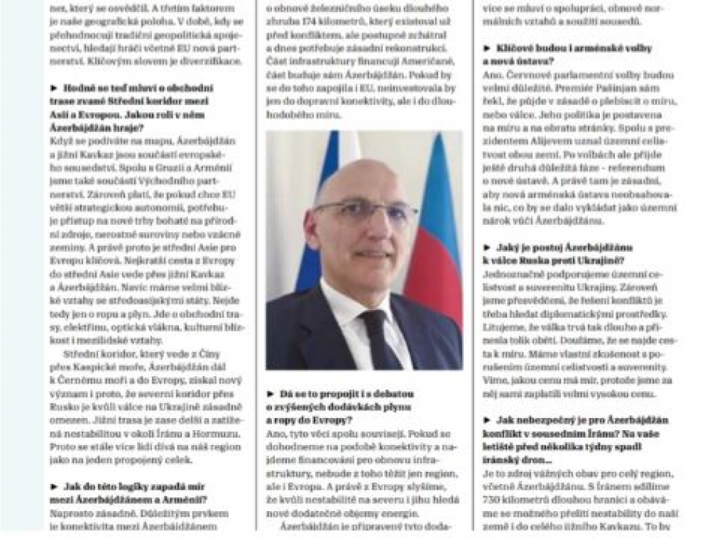 “İki sahil” xəbər verir ki, müsahibə zamanı Azərbaycan-Çexiya strateji tərəfdaşlığı, Orta Dəhlizin artan əhəmiyyəti və bu xüsusda Azərbaycanın Avropa ilə Asiya arasında vacib nəqliyyat qovşağına çevrilməsi, Azərbaycan-Ermənistan normallaşma prosesi, habelə regional təhlükəsizlik məsələləri ətrafında fikir mübadiləsi aparılıb.